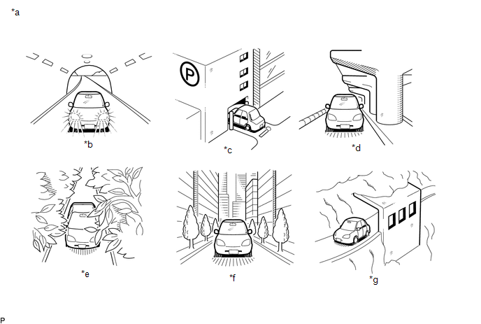 | *e | On a forest or tree-lined path | *f | Between tall buildings |