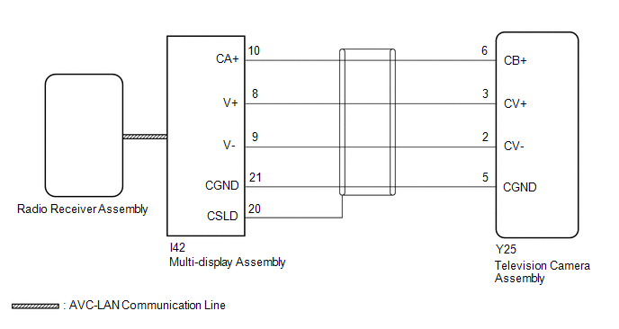 This DTC is stored if the radio receiver assembly judges that the signals or signal lines between the television camera assembly and the multi-display assembly are not normal as a result of its self check.