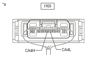 | (c) Measure the resistance according to the value(s) in the table below. Standard Resistance: | Tester Connection | Condition | Specified Condition | | I160-18 (CA4H) - I160-17 (CA4L) | Cable disconnected from negative (-) auxiliary battery terminal | 54 to 69 Ω | HINT: If the resistance becomes normal (between 54 and 69 Ω) when the connector is disconnected from the ECU or sensor, there may be a short in the ECU or sensor. | | | *a | Component with harness connected (Central Gateway ECU [Network Gateway ECU]) | | |