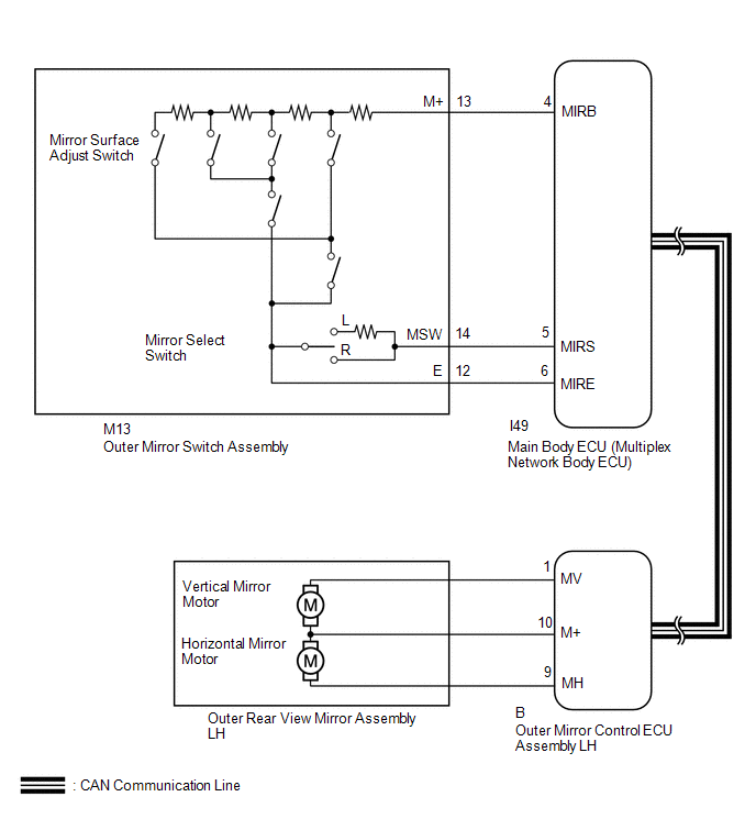 When the outer mirror switch assembly mirror surface adjust switch (up/down/left/right) is operated, up/down/left/right signals are received by the main body ECU (multiplex network body ECU). The main body ECU (multiplex network body ECU) sends the received signals to the outer mirror control ECU assembly LH via CAN communication. The outer mirror control ECU assembly LH receives the remote mirror selection signal and up/down/left/right signals and operates the outer rear view mirror assembly LH up/down/left/right based on the signals.