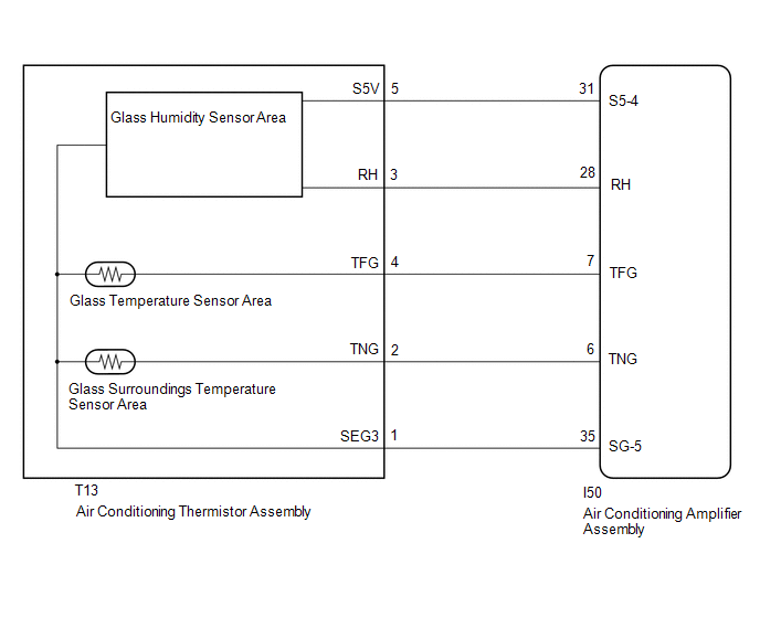 The air conditioning thermistor assembly (glass humidity sensor) detects cabin humidity. The voltage of the air conditioning thermistor assembly (glass humidity sensor) changes in accordance with cabin humidity. The air conditioning amplifier assembly reads the changes in output voltage of the air conditioning thermistor assembly (glass humidity sensor).