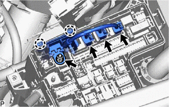 | (b) Connect the 3 connectors and attach the 2 claws to connect the wire harness to the No. 1 engine room relay block. |