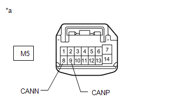| M5-9 (CANP) - M5-8 (CANN) | Cable disconnected from negative (-) auxiliary battery terminal | 54 to 69 Ω |