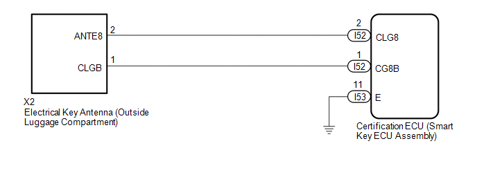 The certification ECU (smart key ECU assembly) generates a request signal and transmits the signal to the electrical key antenna (outside luggage compartment). For the electrical key antenna (outside luggage compartment) to detect when the electrical key transmitter sub-assembly is brought close to the vehicle, the received request signal is transmitted within approximately 1 m (3.28 ft.) of the back door. DTC B27A8 is stored by the certification ECU (smart key ECU assembly) when an open circuit is detected between the certification ECU (smart key ECU assembly) and electrical key antenna (outside luggage compartment) (between terminals CLG8 and ANTE8, or terminals CG8B and CLGB).