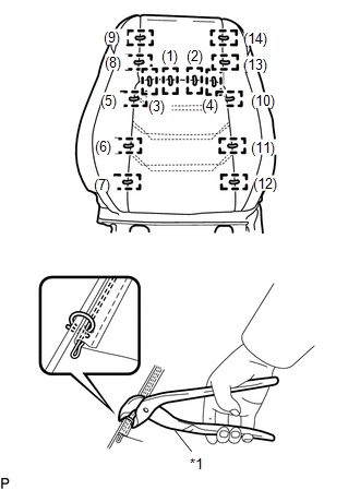 (a) Using hog ring pliers, install the separate type front seatback cover LH to the separate type front seatback pad LH with 14 new hog rings in the order indicated in the illustration.
