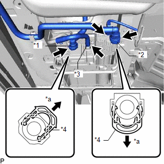 | (a) Disconnect the connector from the canister pump module. | | | *1 | Vent Line Hose | | *2 | Air Inlet Line Hose | | *3 | Purge Line Hose | | *4 | Retainer | | *a | Pull Out | | |
