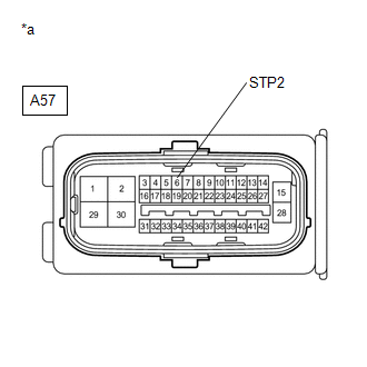 | A57-6 (STP2) - Body ground | Stop light switch assembly on (Brake pedal depressed) | 11 to 14 V |