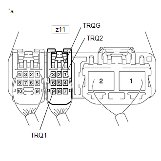 | z11-1 (TRQ2) - z11-2 (TRQG) | Power switch on (READY), steering wheel not being turned (without load) | 2.3 to 2.7 V |